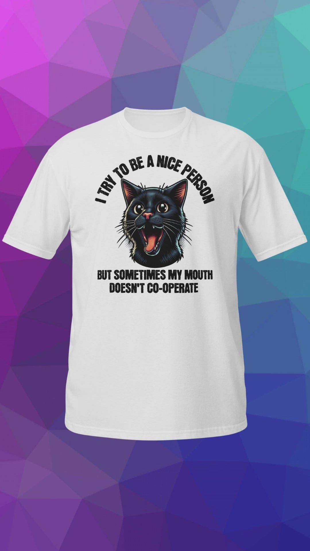 I try to be a nice person but sometimes my mouth doesn't co-operate mug: Quirky 11oz ceramic mug. Perfect for cat lovers and Monday haters! 🐾☕